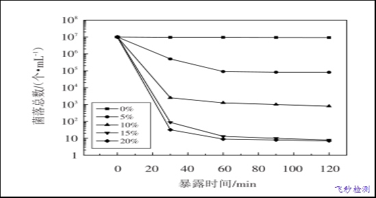 從圖1中可知,不添加抗菌單體,抗菌涂料的細菌存活數較高;添加抗菌單體之后,隨著暴露時間的延長,細菌存活數不斷降低;在暴露時間固定的情況下,抗菌劑用量越多,細菌存活數降低,抗菌劑質量分數達到20%時,暴露120 min后,細菌菌落總數存活數低于10 個/mL,表明抗菌涂料具有良好的抗菌性能。