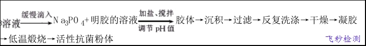 以化學純的N a 3 P0、AgN 0 3 、Cu(N O ) 3 ) 2 、Zn(N 0 3 ) 2 ,明膠等為主要原料,采用溶膠一凝膠法分別制備出Ag 3 PO4 、Ag 3 PO 4 -Zn 3 (PO 4 ) 2 (Ag-Zn復合)、Ag 3 PO 4 -Cu 3 (PO 4 ) 2(Ag-Cu復合)及Ag 3 PO4 -Zn 3 (PO 4 ) 3 -Cu 3 (PO 4 ) 2 (Ag-Zn-Cu復合)的超細抗菌粉體。其制備工藝流程如下: