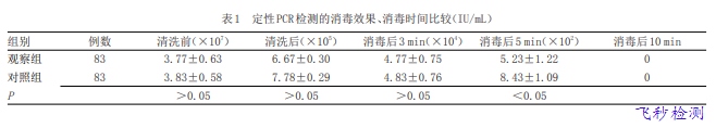 定性PCR檢測的消毒效果、消毒時間比較 觀察組在 消毒后5 min,定性PCR檢測的乙肝病毒脫氧核糖核酸含量為 (5.23±1.22)×102 IU/mL,低于對照組的(8.43±1.09)× 102 IU/mL,差異有統計學意義(P<0.05),見表1。
