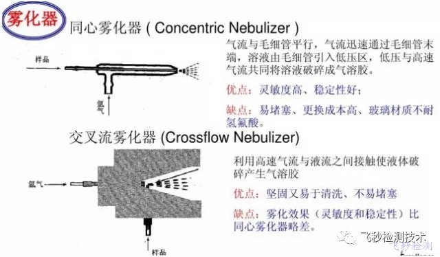 ②霧化器: 維護霧化器的頻率主要取決于被分析樣品的類型及霧化器的具體設計。例如,在交叉型霧化器中,氬氣直接以90°通入毛細管管頭,而在同心霧化器中氬氣輸入方向與毛細管平行。