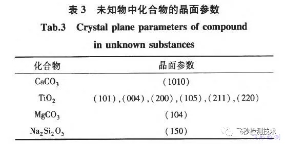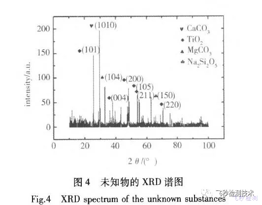 圖4為未知物的XRD譜圖,根據晶面數據和衍射峰的強度,并結合XRD譜圖數據庫,可以判斷出未知物中含有CaC03、Ti02、MgC03、Na2Si205化合物,其晶面參數見表3,結合能譜分析數據可以判斷該未知物中團聚的顆粒為TiO2。