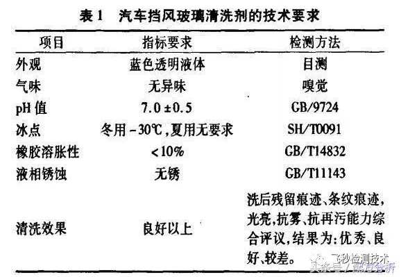 汽車擋風玻璃清洗劑尚無國家標準和行業標準,根據汽車擋風玻璃清洗劑的技術特點和使用要求,汽車擋風玻璃清洗劑技術要求見圖3。
