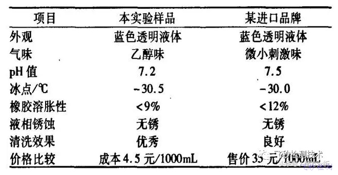 按質量分數,水60%、乙醇39%、AEO一9 0.3%、LAS 0.2%、其他助機劑0.5%,混合制得汽車 擋風玻璃清洗劑,外觀為藍色透明液體,乙醇氣味無 刺激,pH值接近中性,冰點滿足北方冬季要求,橡膠溶脹性小,液相銹蝕性實驗達到無銹,清洗效果達到 優秀,主要指標優于進口樣品,并具有成本低廉的優點。