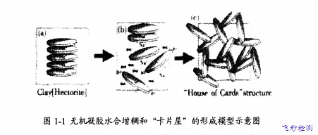 高分子量增稠劑主要有蒙脫土、膨潤土、硅酸土、水輝石、海泡石等。其中膨潤土的使用效果最好,商業價值最高邸。其基本的增稠機理是礦物本身的某種特殊結構具有吸水膨脹的作用,通過吸水膨脹作用形成凝膠礦物,提高體系的粘度。在稀溶液中,隨著電解質濃度的增加,片晶表面的電荷減少,粒子間的作用力由排斥力轉變為吸引力,平行的片晶彼此之間交聯在一起形成“卡片屋”的 結構,通過水合作用溶脹產生凝膠,從而達到增稠效果。無機凝膠水合增稠和“卡片屋”的形成過程如圖1.1所示。